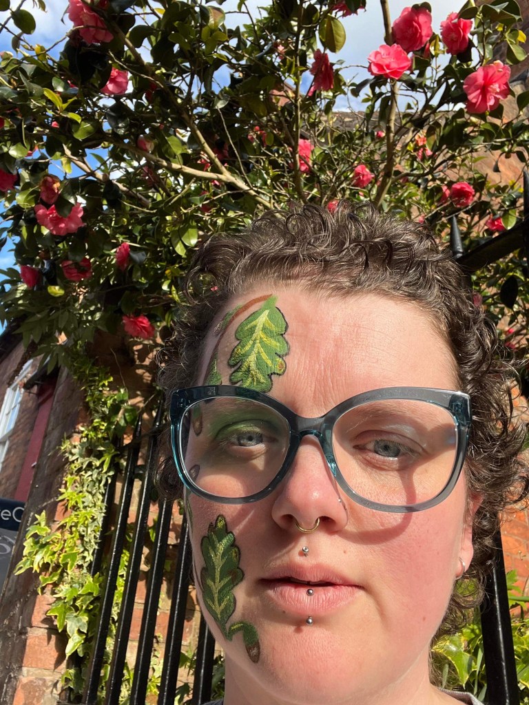 This year I’m learning ancient UK crafts and exploring nature – I love an oak and acorns for the potential they have to grow and make even more mighty oaks. Kim at the Holistic Photographer organised a photo shoot with a very talented Make Up Artist. Here I am camouflaging and growing branches and flowers from my head!